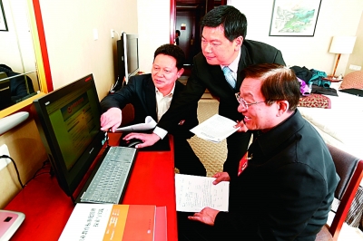 3月1日,全國政協(xié)委員楊興平(左)、楊學(xué)義(右)、蘇華(中)在駐地賓館就相關(guān)提案進行交流。