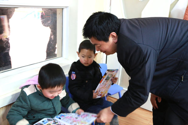 與會(huì)人員參觀新落成的德外幼兒園時(shí),理事長(zhǎng)與小朋友在一起