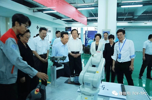 在唐山工業(yè)職業(yè)技術(shù)學(xué)院,陳昌智考察了學(xué)院校史館,共建企業(yè)——拓又達(dá)科技集團(tuán)公司和曹妃甸合心機(jī)器人系統(tǒng)集成有限公司,與中車集團(tuán)唐車公司共建的動車組技術(shù)實訓(xùn)區(qū),省級院士工作站——快速制造中心等實訓(xùn)基地;體驗了機(jī)器人書法繪畫,詳細(xì)了解了學(xué)生的實訓(xùn)和學(xué)習(xí)情況,詢問了專業(yè)教師快速制造技術(shù)在教學(xué)和實踐中的應(yīng)用。